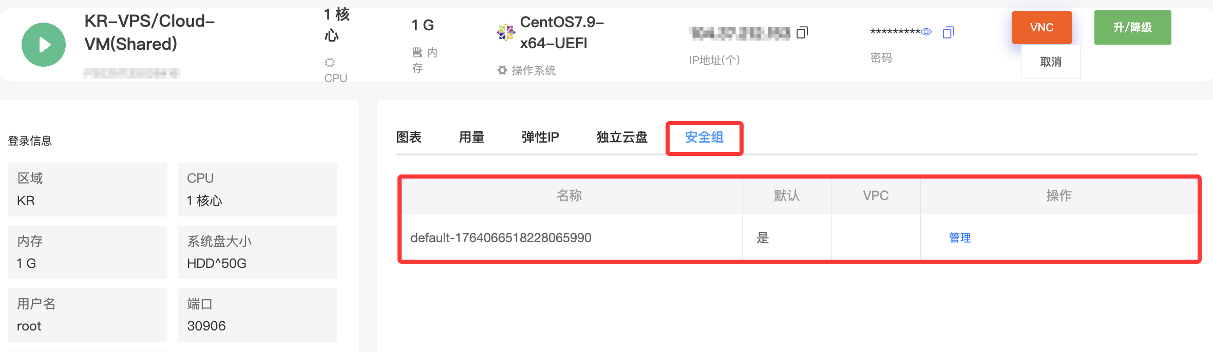 查看方式:通过平台导航路径 我的服务器 / VPS/公有云 点击进入机器管理产品页面,选择安全组,就可以看到这台机器关联的安全组。