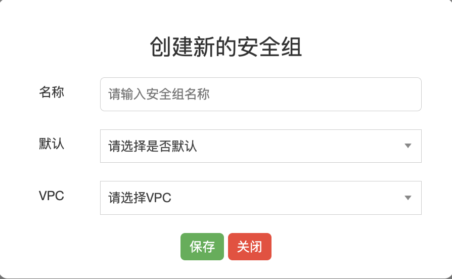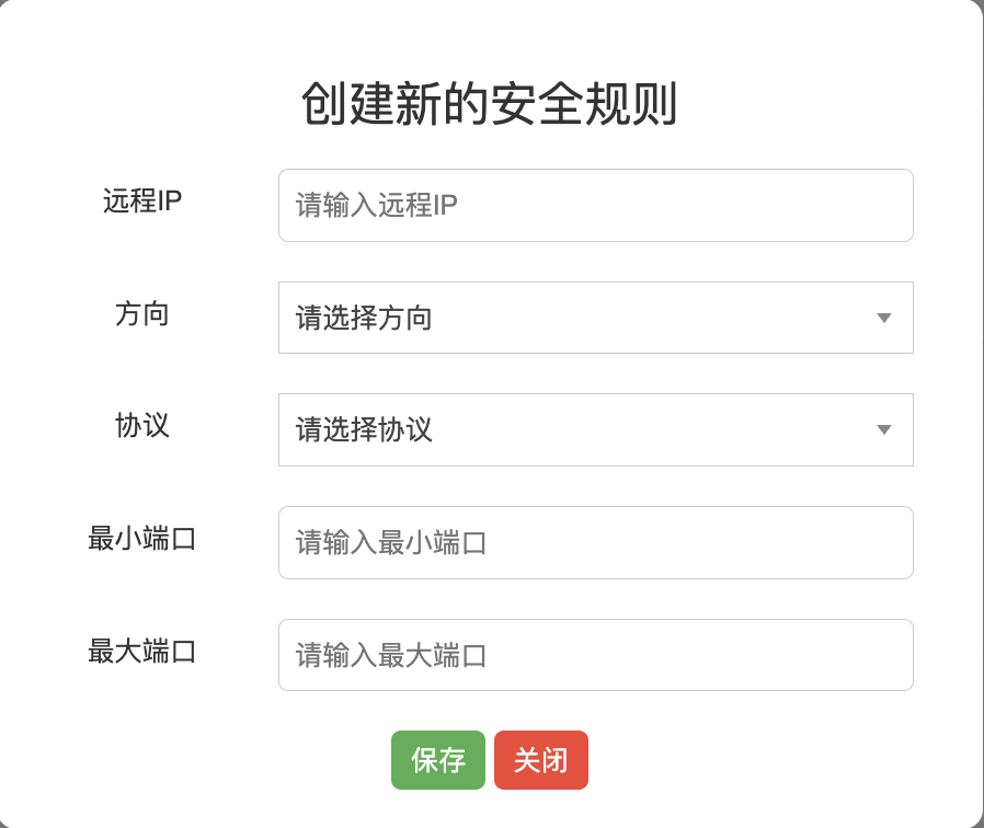 填写完成后,点击 “保存” 按钮完成创建,新安全组会显示在列表中;若放弃创建,点击 “关闭” 即可。