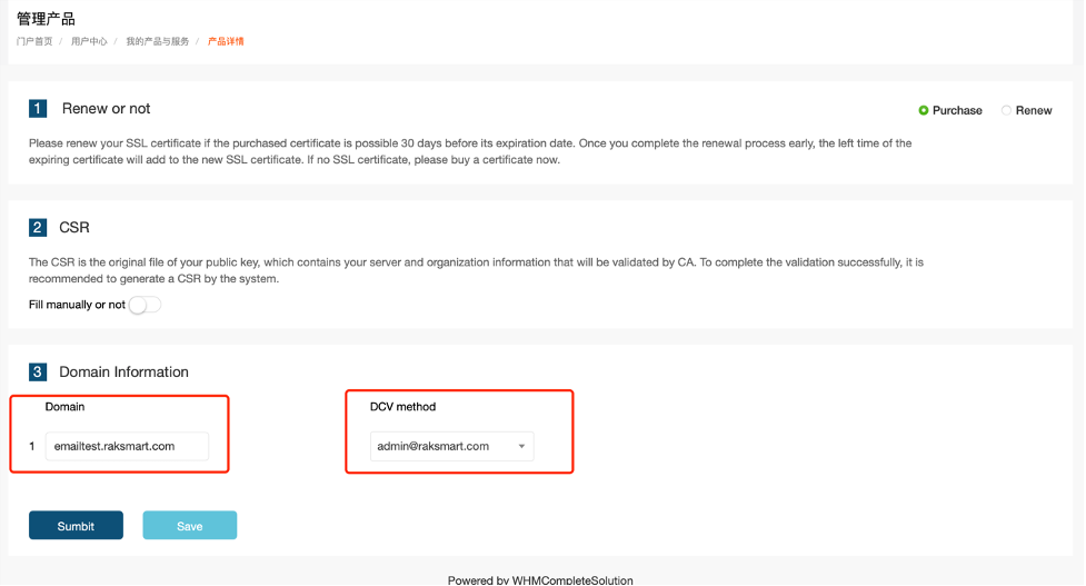 填写 Domain,选择 DCV method,Save 后Sumbit.
