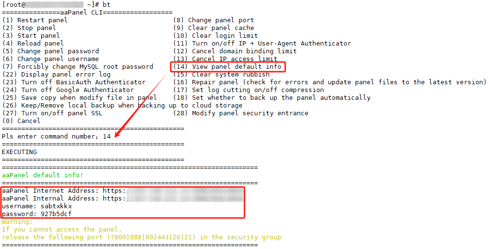 First, we log into the system by SSH, type "bt", then press "14", and we can view the aaPanel information.