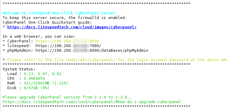 First, you can log into the system via SSH. Upon first login, you will be prompted with the CyberPanel link.