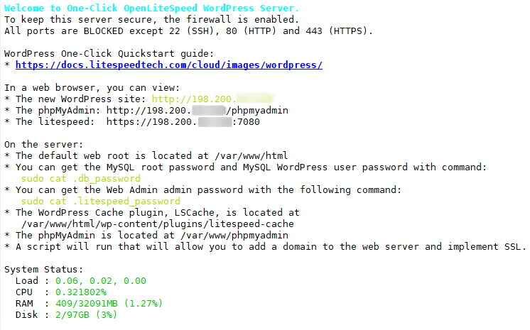 First, we log into the system via SSH. On the first login, it will prompt for the WordPress link.